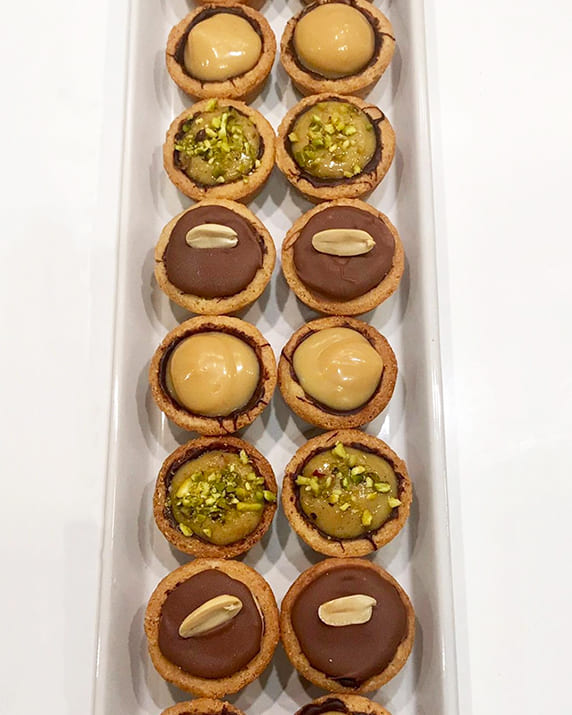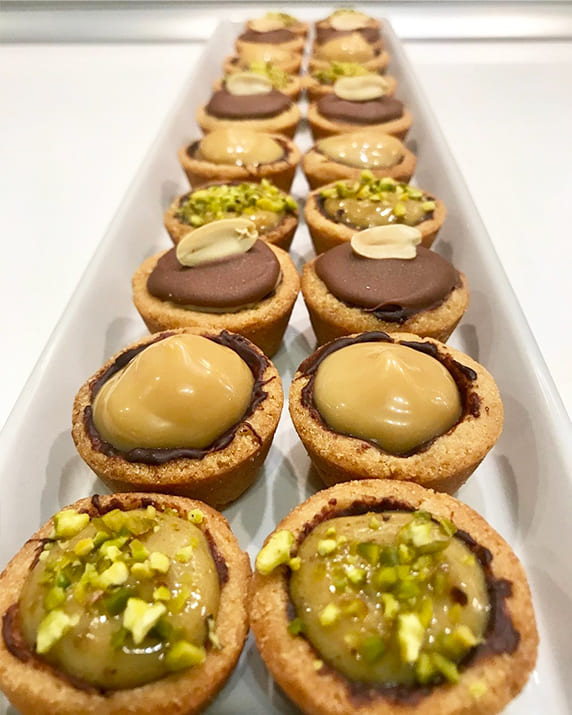 Mini tartellette, un must per non sbagliare mai. Preparate con fondo di cioccolato, crema al pistacchio, crunchy di nocciole pralinate e dulce de leche.